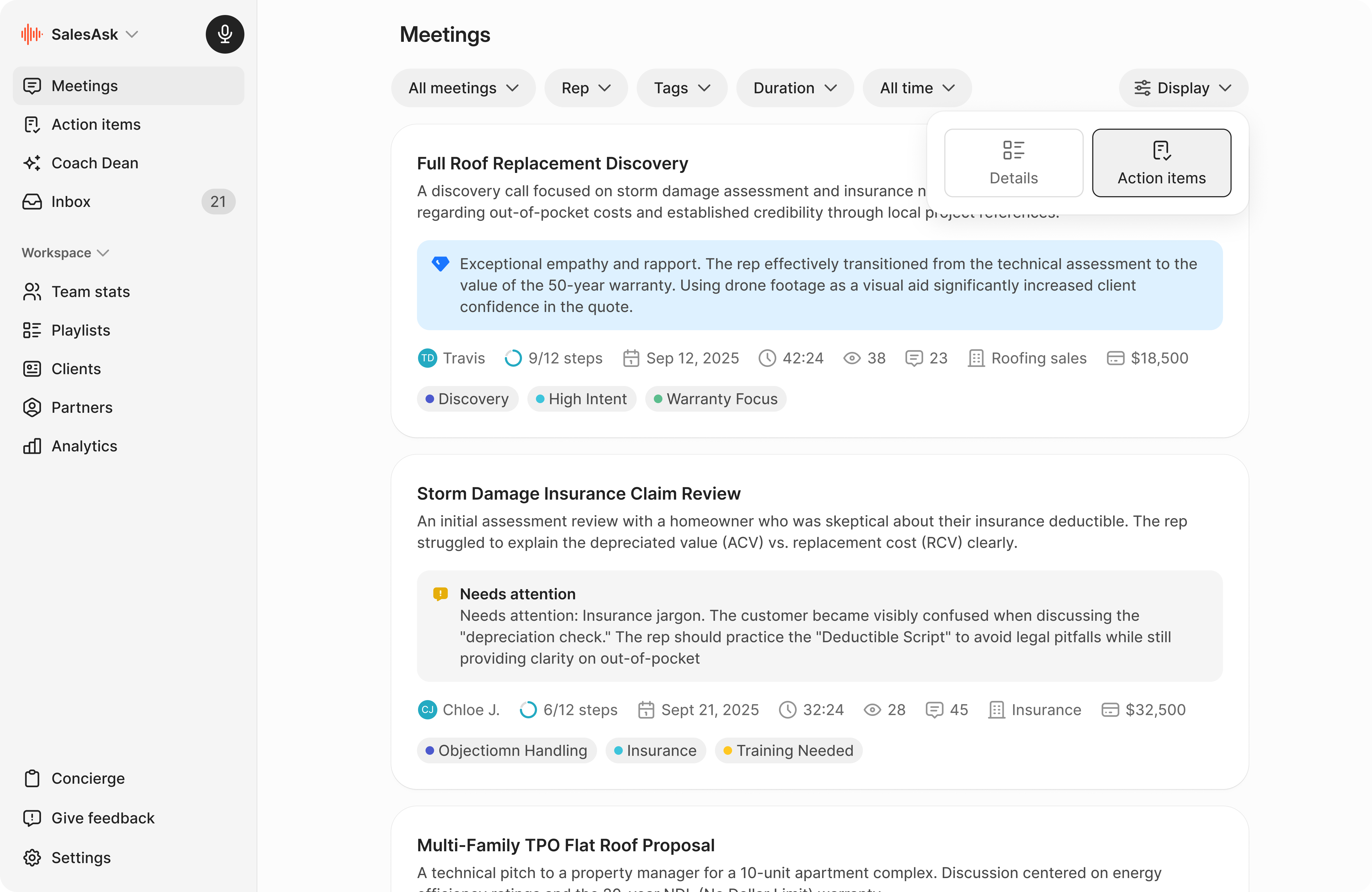 Most reps miss upsells because they lose track of the process under pressure. Our AI identifies "hinge moments" in the conversation. If a rep skips the financing options or fails to mention a premium warranty, Coach Dean flags it and gives the rep a specific action plan for their next call. Our users see an average 25% increase in ticket size within the first 60 days.