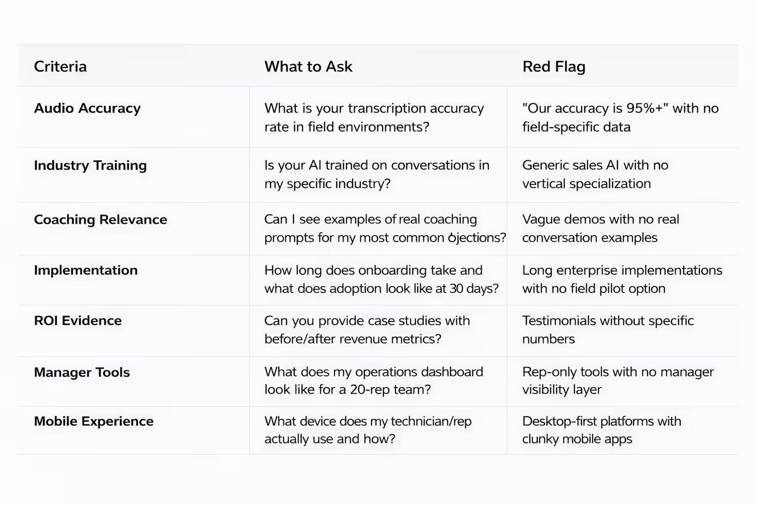 1. Accuracy Does the AI actually understand what is being said — in real-world audio conditions, with background noise, accents, and industry-specific terminology? Transcription accuracy is the foundation everything else is built on. If the AI mishears the conversation, every coaching prompt, every performance score, and every manager insight built on top of that transcription is compromised.