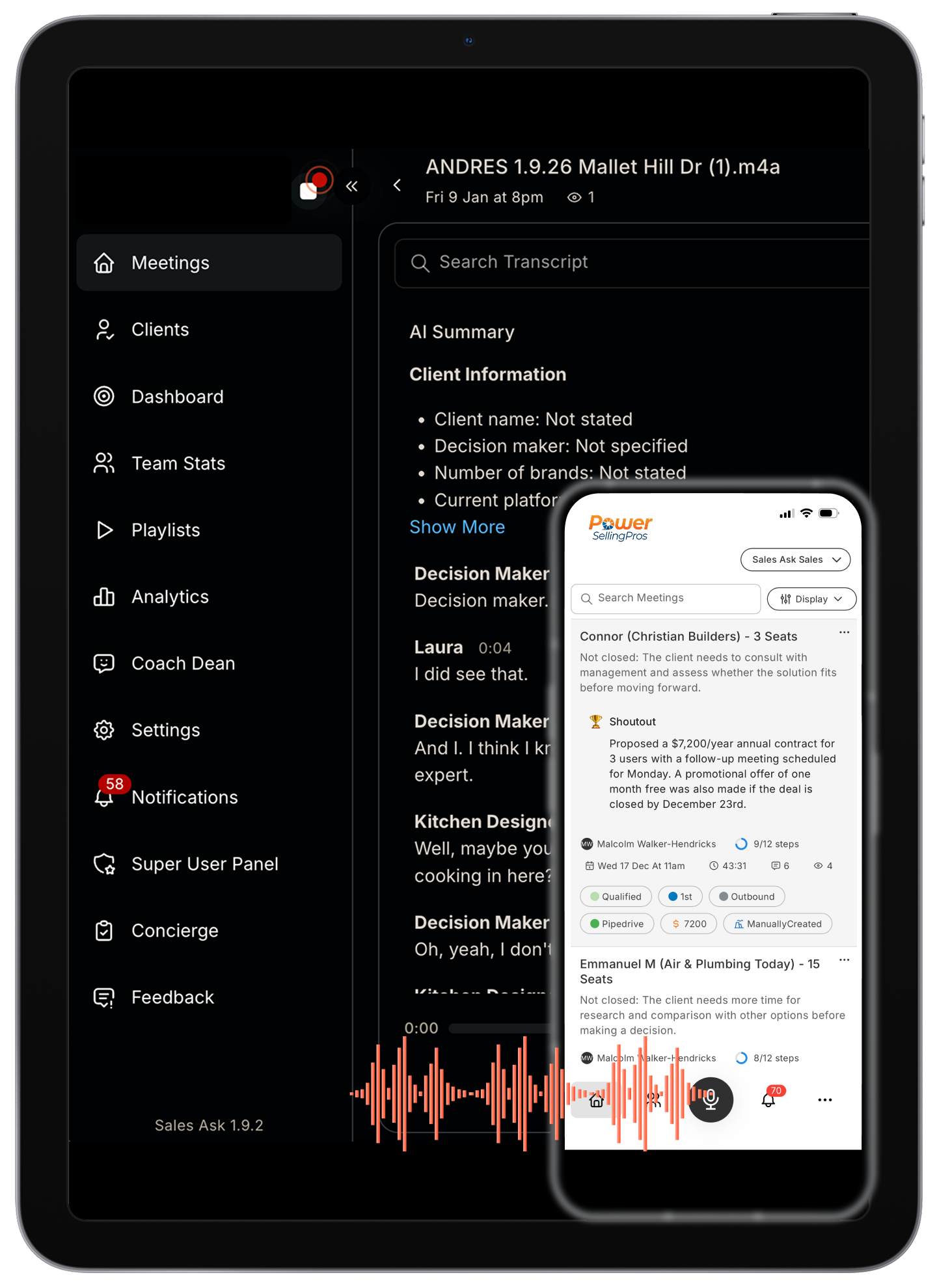 Sales Ask records your in person sales conversations, transcribes them to texts and analyzes them.